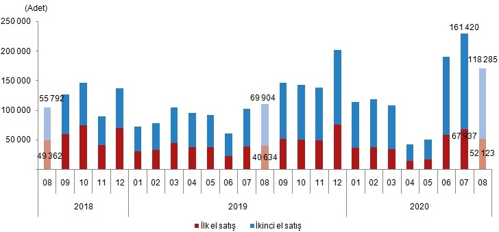 Türkiye genelinde ikinci el konut satışları 2020 Ağustos ayında bir önceki yılın aynı ayına göre %69,2 artış göstererek 118 bin 285 oldu. İkinci el konut satışlarında İstanbul 22 bin 189 konut satışı ve %18,8 pay ile ilk sıraya yerleşti. İstanbul'daki toplam konut satışları içinde ikinci el satışların payı %73,3 oldu. Ankara 13 bin 240 konut satışı ile ikinci sırada yer aldı. Ankara'yı 7 bin 952 konut satışı ile İzmir izledi.