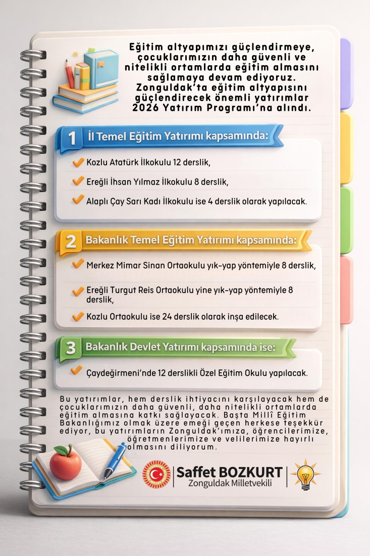 AK Parti Zonguldak Milletvekili Saffet Bozkurt, il temel eğitim yatırımı kapsamında, Kozlu Atatürk İlkokulu 12 derslik, Ereğli İhsan Yılmaz İlkokulu 8 derslik, Alaplı Çay Sarı Kadı lıkokulu ise 4 derslik olarak yapılacağını; Bakanlık temel eğitim yatırımı kapsamında Merkez Mimar Sinan Ortaokulu yık-yap yöntemiyle 8 derslik, Ereğli Turgut Reis Ortaokulu yine yık-yap yöntemiyle 8 derslik, Kozlu Ortaokulu ise 24 derslik olarak inşa edileceğini, Bakanlık Devlet Yatırımı kapsamında ise, Çaydeğirmeni'nde 12 derslikli Özel Eğitim Okulu yapılacağını bildirdi.