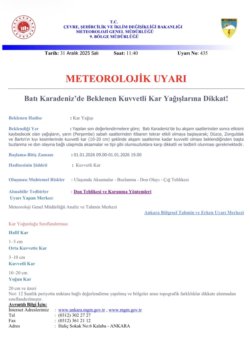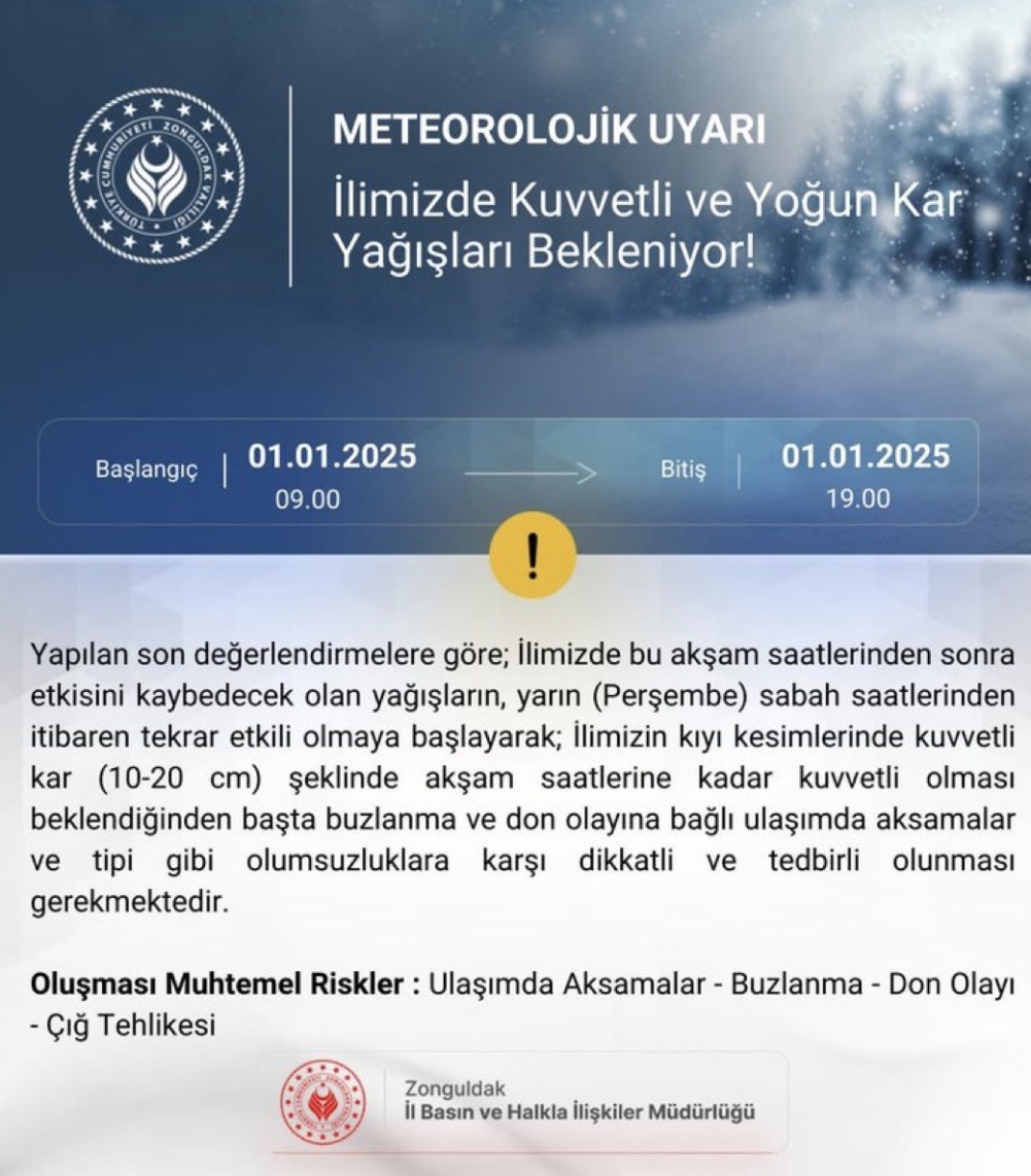 Açıklamada, Zonguldak, Düzce ve Bartın’ın kıyı kesimlerinde kar yağışının gün boyunca yer yer kuvvetli olacağı ve 10-20 santimetre aralığında kar birikimi beklenildiği ifade edildi. Yağışın 01.01.2026 saat 09.00 ile 19.00 arasında etkili olacağı belirtildi.