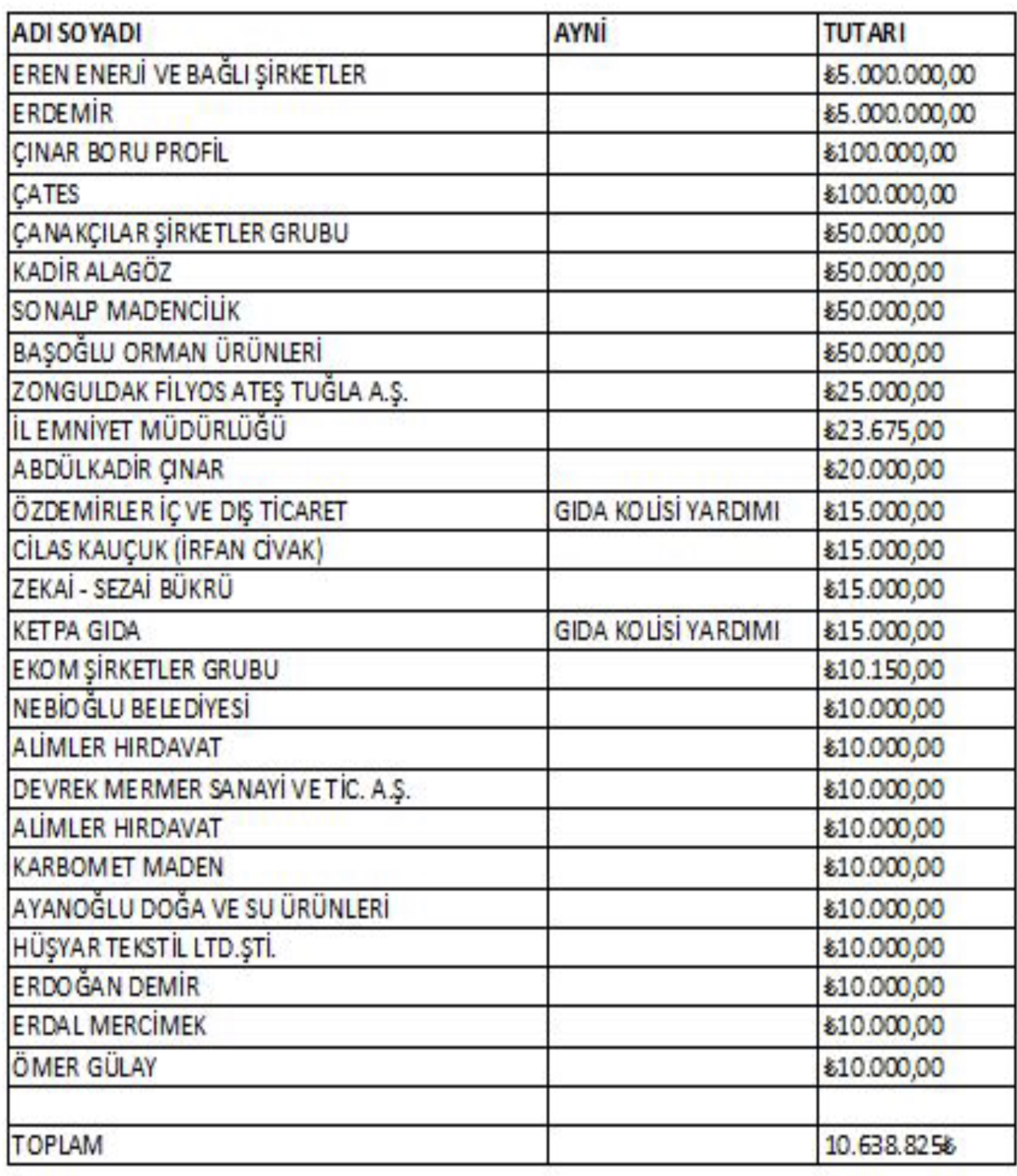 Türkiye genelinde afet bölgeleri için başlatılan yardım kampanyasına Zonguldak'tan toplam 10.638.825 TL nakdi yardım toplandı. Listenin başını ERDEMİR ve Eren Enerji çekti.