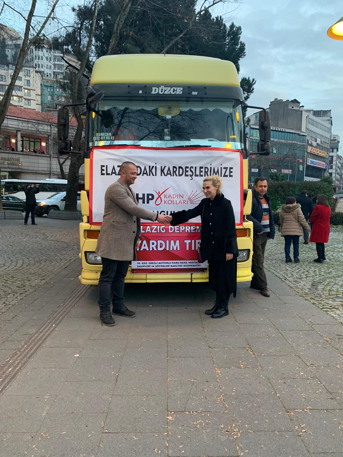 CHP Kadın Kolları Başkanı Merve Kır ve Ana Nakliyat Ereğli Kooperatifi Başkanı Okan Yazgeldi, işbirliği ile yapılan bir tır dolusu malzeme, Elazığ’a doğru yola çıktı.