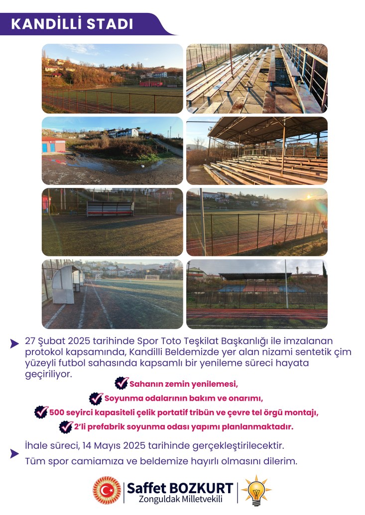 AK Parti Zonguldak Milletvekili Saffet Bozkurt, Kandilli Stadı yenilenme ihalesinin 14 Mayıs 2025 tarihinde yapılacağını belirtti.